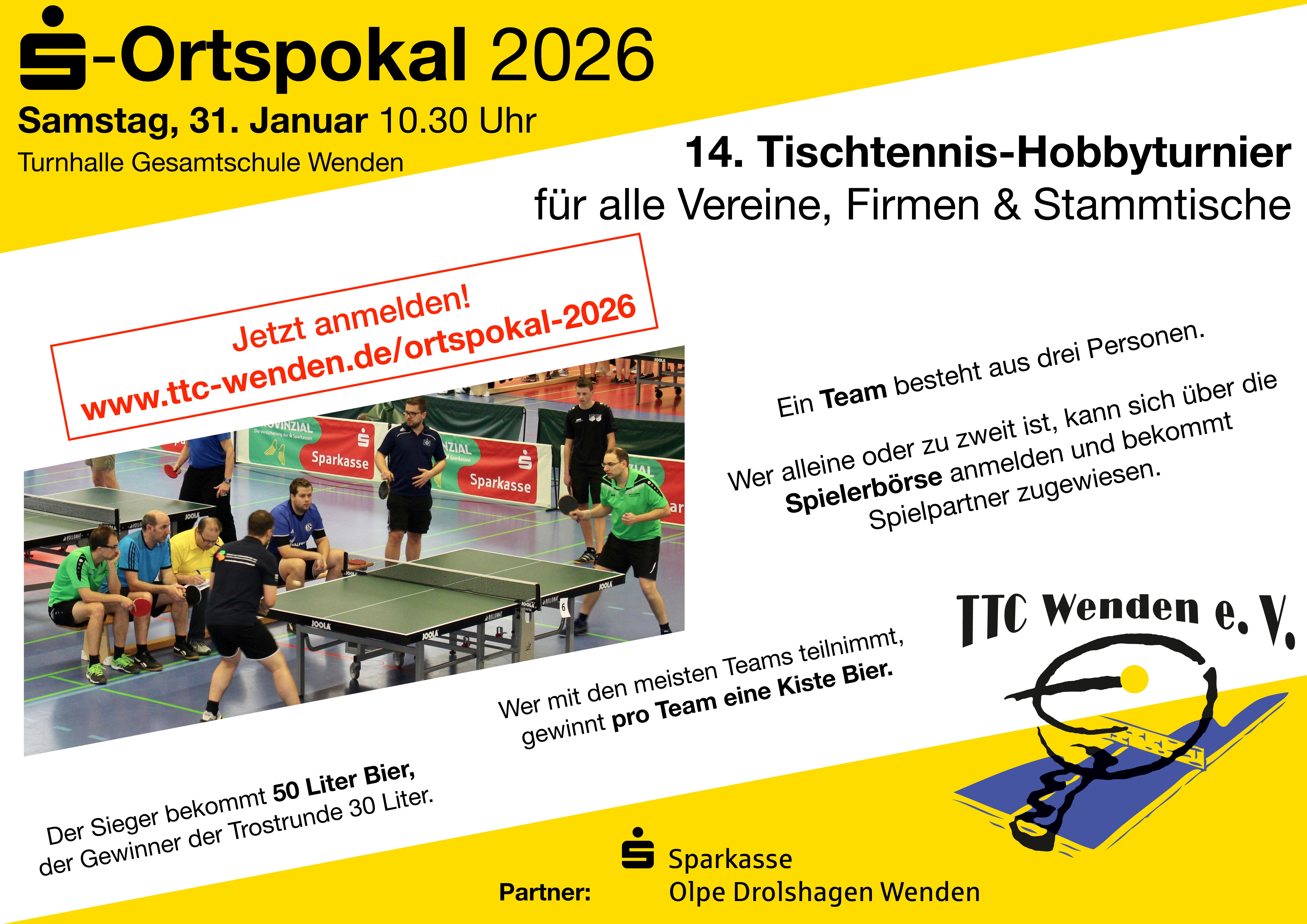 Der TTC Wenden bittet wieder an die Platten: Zum 14. Mal richtet der Tischtennis-Club den Sparkassen-Ortspokal aus – das Hobbyturnier für alle Vereine, Stammtische, Firmen und Freundesgruppen aus der Gemeinde Wenden und darüber hinaus. Wie immer findet die Veranstaltung am letzten Samstag im Januar statt, also am 31. Januar 2026.