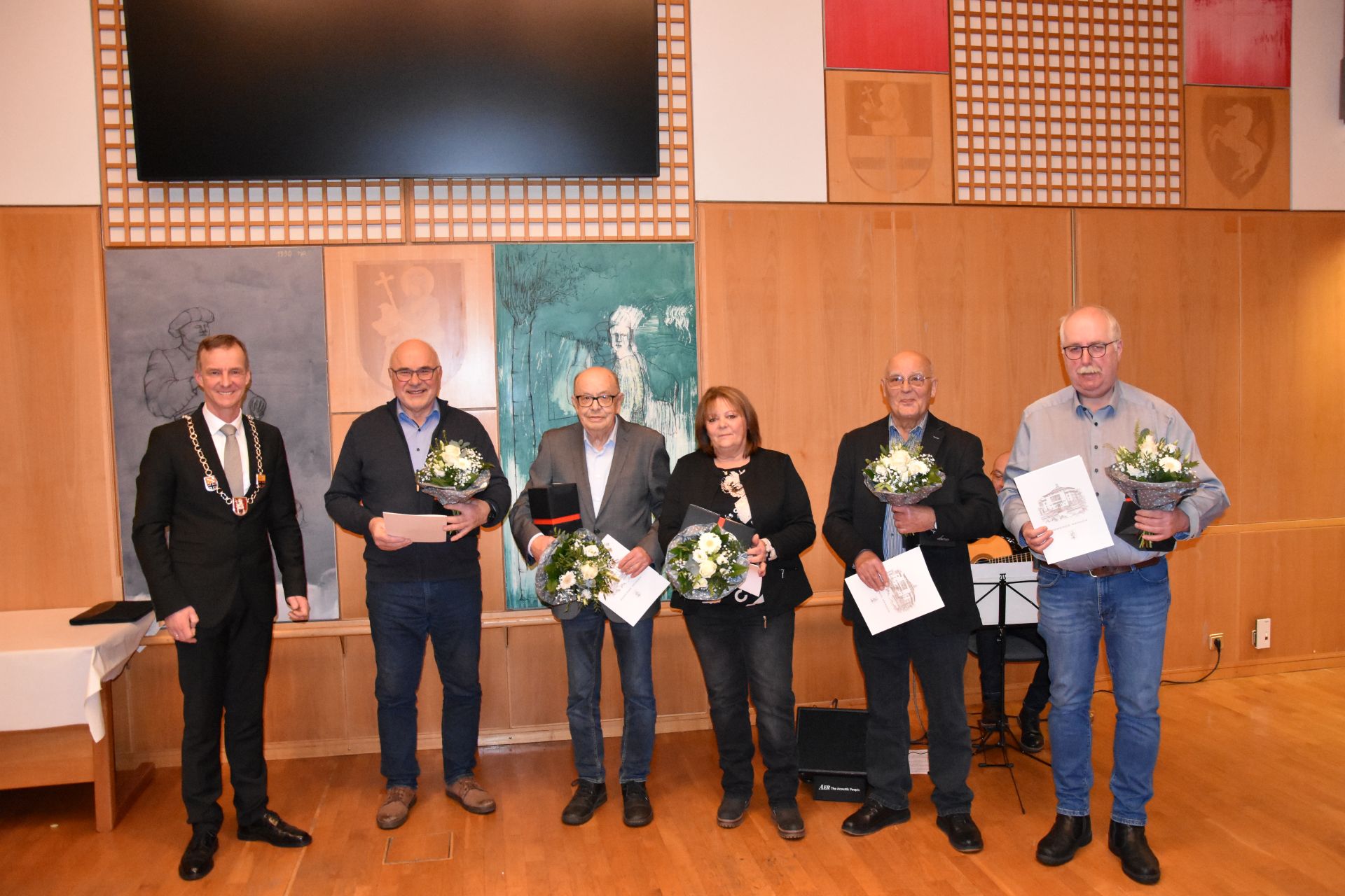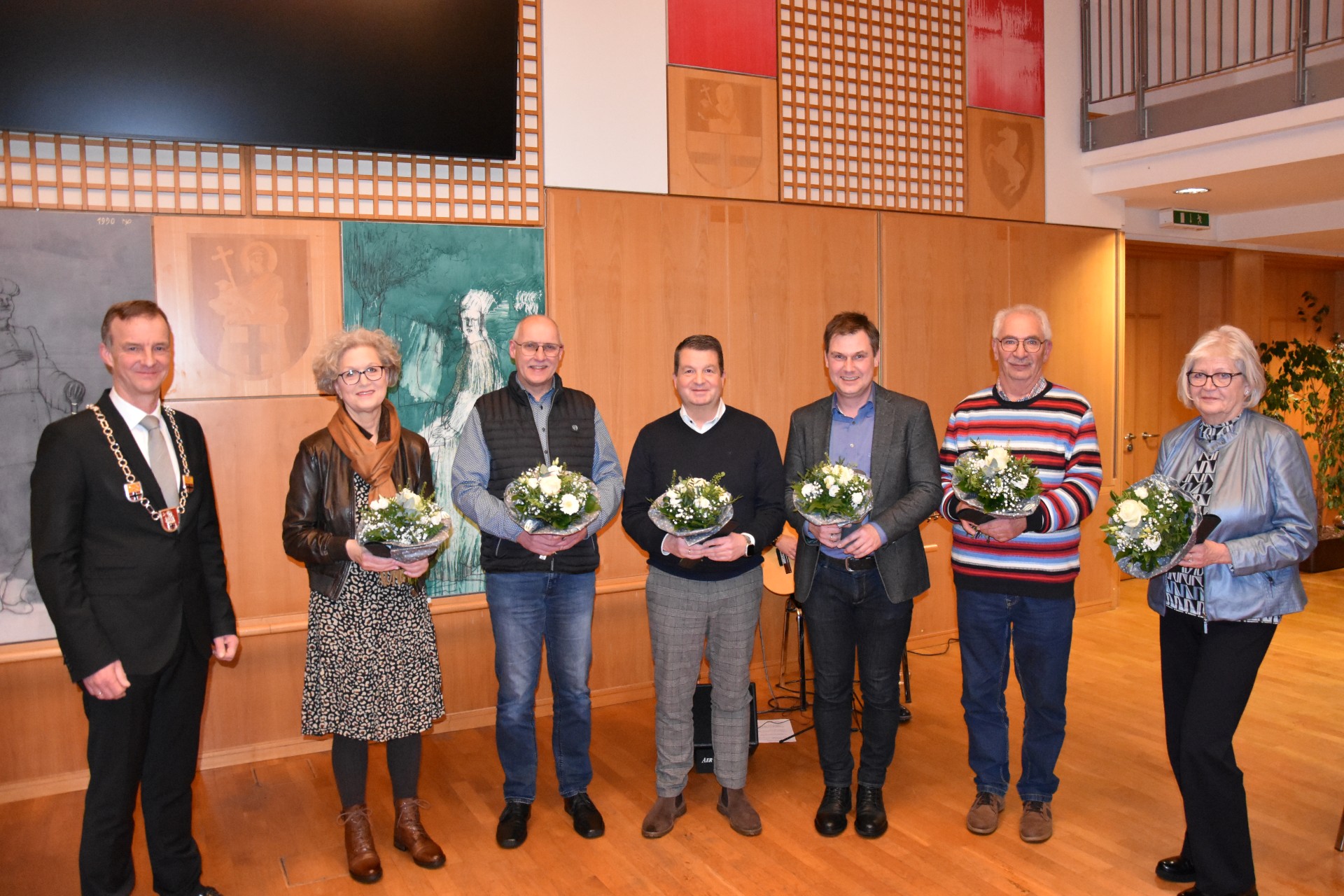 Astrid König-Ostermann wurde aufgrund ihrer über 25-jährigen Tätigkeit im Gemeinderat mit dem Ehrentitel „Ehrenratsfrau“ ausgezeichnet. Die ehemaligen Ratsmitglieder Ulrich Heinrich, Heinz Zimmermann, Wolfang Solbach und Robert Dornseifer dürfen sich zukünftig „Ehrenratsherr“ nennen.