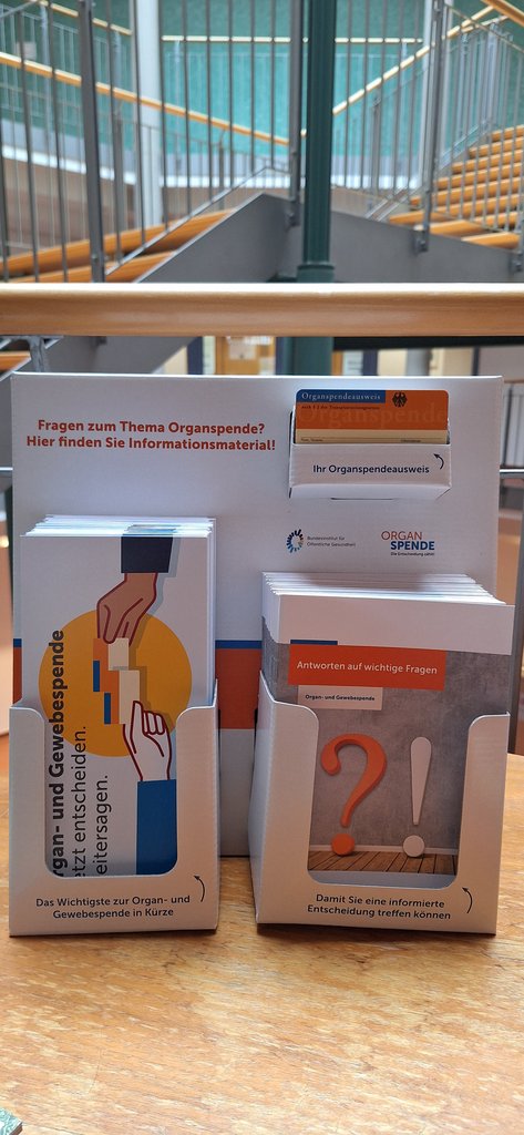 Ab sofort erhalten Sie Organspendeausweise auch direkt bei uns im Rathaus. Im Eingangsbereich liegen Ausweise sowie Flyer mit wichtigen Informationen und Antworten auf häufige Fragen rund um die Organspende für Sie bereit.
