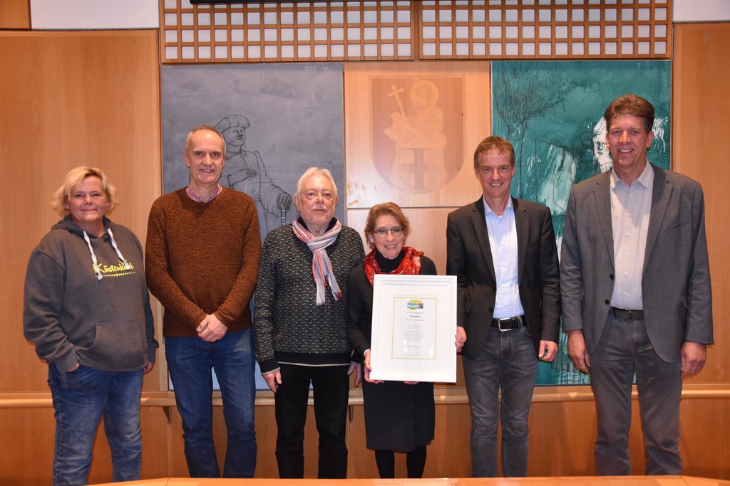 Bild: Wenden bleibt „Fair“! Die Mitglieder der Steuerungsgruppe Nicole Williams, Elmar, Holterhof, Gerd und Hella Pelz, Bürgermeister Bernd Clemens und Paul Sieler freuen sich über die erneute Zertifizierung. Es fehlen Bianka Feldmann und Christoph Kinkel.