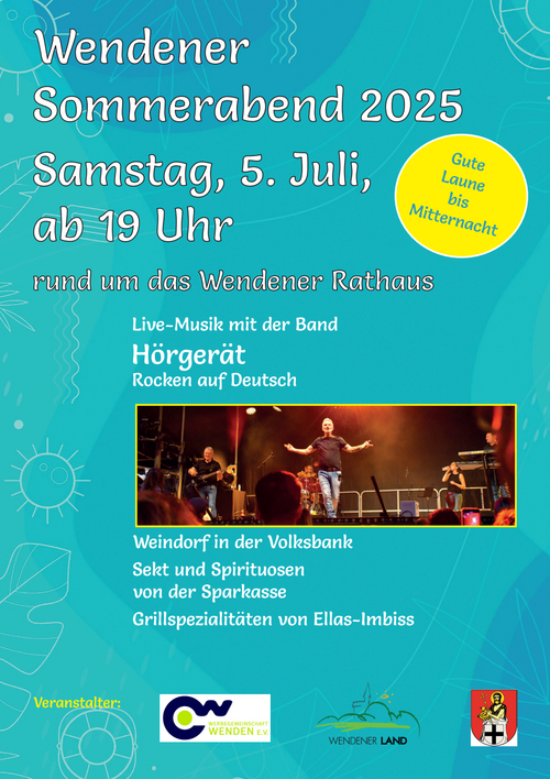 Seit vielen Jahren stellt der Wendener Sommerabend ein Highlight im Wendschen Veranstaltungskalender dar! Denn dann wird ab 19 Uhr rund ums Rathaus zünftig gefeiert! Der diesjährige Sommerabend am Samstag, 5. Juli, steht wieder ganz im Zeichen von ehrlicher deutscher Rock- und Popmusik! Hier konnte die Werbegemeinschaft in diesem Jahr auf vielfachen Wunsch - und damit zum dritten Mal - erneut die überregional bekannte Band „Hörgerät“ gewinnen.